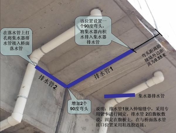 為有效排除伸縮縫內(nèi)積水及避免伸縮縫位置滲漏對(duì)橋梁、墩柱外觀及實(shí)體質(zhì)量的影響,二環(huán)南路四標(biāo)項(xiàng)目部在公司總工辦指導(dǎo)下,進(jìn)行伸縮縫集水器排水管安裝。