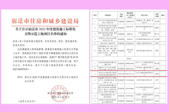 用心做好文明施工積極打造文明示范工地沭陽縣臺州路改造工程(道路部分)獲評標(biāo)準(zhǔn)化文明示范工地 3月21日,宿遷市住房和城鄉(xiāng)建設(shè)局公布了2022年度建筑施工標(biāo)準(zhǔn)化文明示范工地項(xiàng)目,集團(tuán)承建的沭陽縣臺州路改造工程(杭州路至珠海路)(道路部分)工程獲評。 2022上半年,工程曾榮獲江蘇省省級星級標(biāo)準(zhǔn)化安全文明工地。項(xiàng)目部始終貫徹落實(shí)集團(tuán)創(chuàng)優(yōu)工作,對安全文明工地進(jìn)行提前策劃,施工過程嚴(yán)格按照質(zhì)量標(biāo)準(zhǔn)管理,本次宿遷市建筑施工標(biāo)準(zhǔn)化文明示范工地申報(bào)工作,項(xiàng)目部及上級單位高度重視、提前組織、精心準(zhǔn)備,也充分展現(xiàn)了集團(tuán)安全文明施工的管理水平和企業(yè)文化。 接下來,項(xiàng)目部將堅(jiān)定不移地推行施工工藝標(biāo)