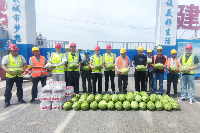 烈日炎炎、驕陽似火,進(jìn)入7月以來,連續(xù)多日發(fā)布高溫橙色預(yù)警,為做好高溫期間安全生產(chǎn)工作,保障現(xiàn)場施工安全,匯通集團(tuán)分會組織開展“夏送清涼”慰問一線活動,深入工地、走近工友,把清涼送到施工一線、把關(guān)懷送到職工心坎里。 7月6日,分管經(jīng)理袁鵬、綜合辦公室主任馬婕帶領(lǐng)匯通集團(tuán)分會小組走進(jìn)項目部,開展“夏送清涼”慰問一線活動,為每個施工班組送上清熱解渴的礦泉水、西瓜、綠豆等防暑降溫物資,對炎炎夏日奮戰(zhàn)在一線的廣大職工及勞務(wù)人員表示親切慰問,叮囑一線人員要保證人身安全,適當(dāng)科學(xué)合理安排作息時間,根據(jù)氣溫情況,避開高溫時段,切實做好防暑降溫工作,同時要求各施工隊伍堅持“安全高于一切、質(zhì)量重于泰山”理