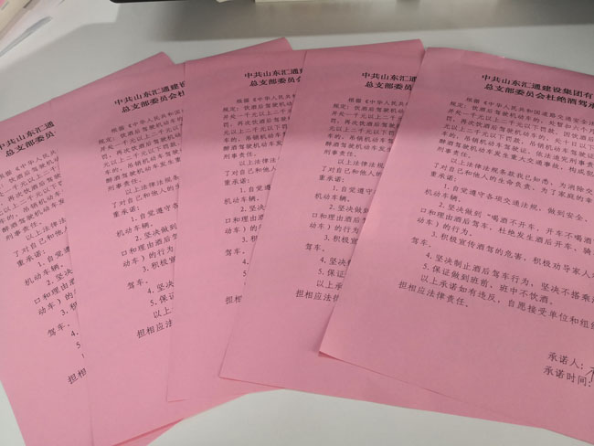 為進一步提高分公司全體黨員干部自覺遵守黨的紀律和國家法律法規(guī)意識,有效遏制酒后駕車問題發(fā)生,近日,匯通公司黨總支組織簽訂《杜絕酒駕承諾書》。