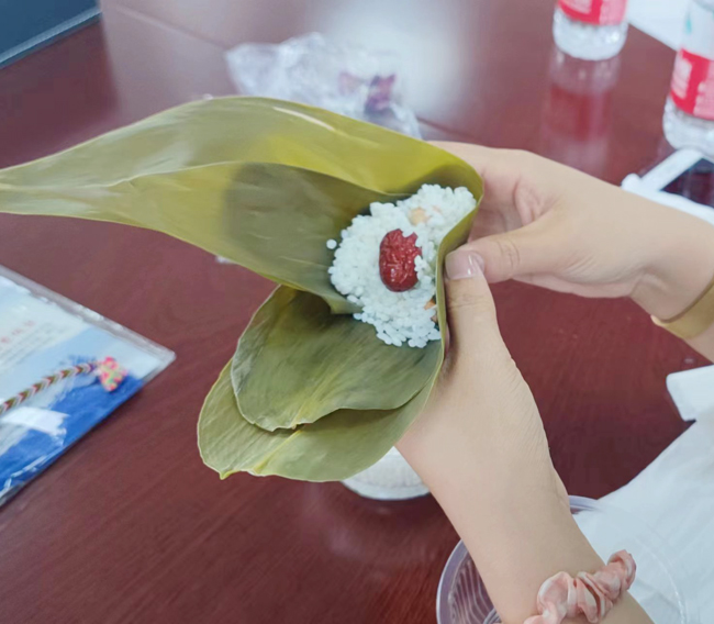 最后一個(gè)環(huán)節(jié)包粽子,提前泡好的糯米、粽葉、大棗、粽線等材料,職工們?cè)诶蠋煹闹笇?dǎo)下互幫互學(xué),卷幾片粽葉、抓一把糯米、放一顆紅棗,雖然很多職工是第一次包粽子,但大家按照步驟一步一步操作,包的是有模有樣,樂在其“粽”。活動(dòng)現(xiàn)場歡聲笑語、其樂融融。